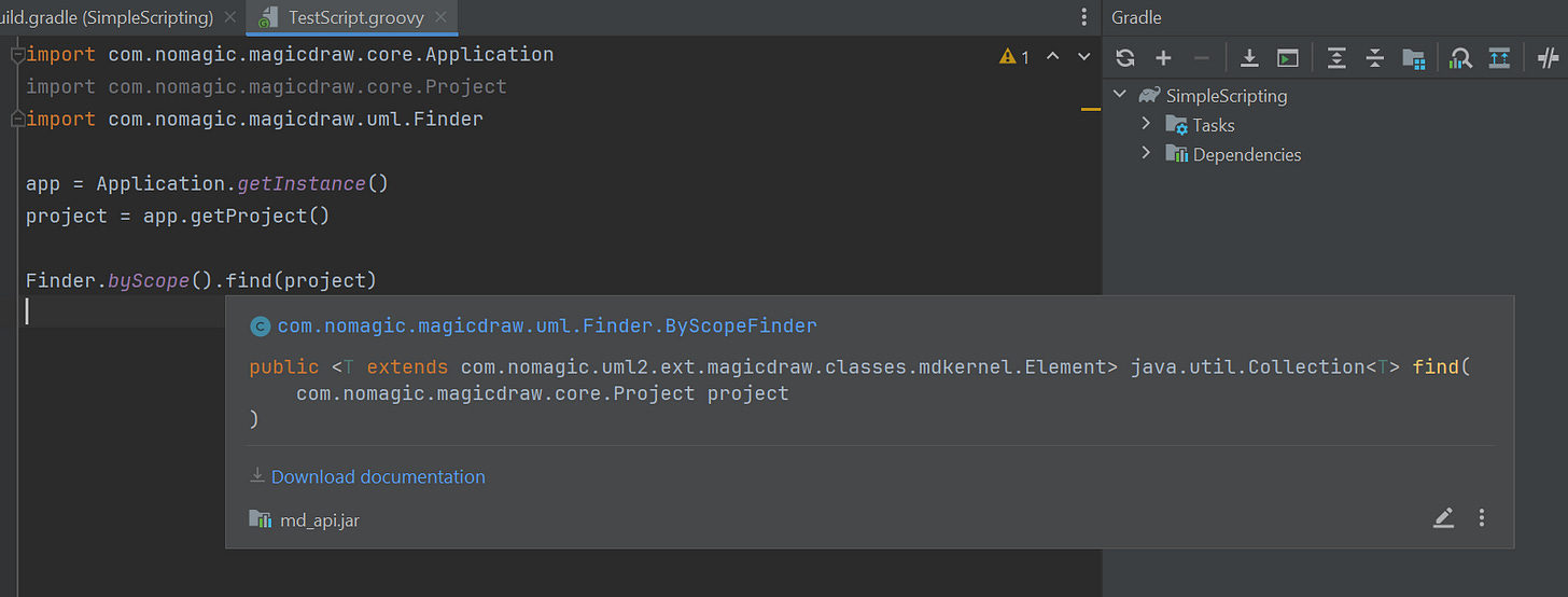 This demonstrates how to leverage the navigation and static debugging power of your IDE to generate Magicdraw scripts. Note that this doesn’t help with dynamic debugging (the running code), as that gets more complex, and Dassault has guides for that. This approach allows for quicker and easier generation of simple scripts by importing Magicdraw libraries into your IDE using Gradle, then auto-completion using Intellij features.
