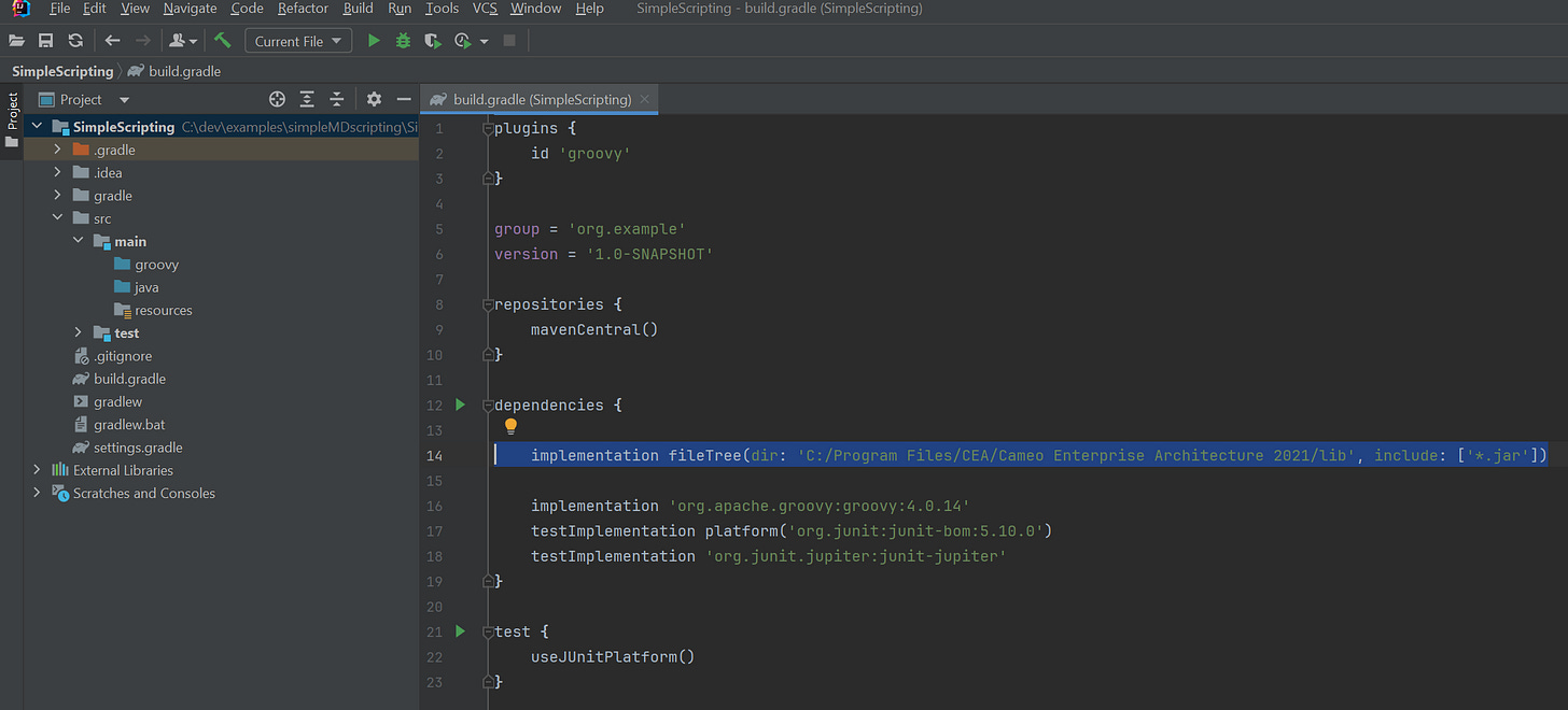 implementation fileTree(dir: 'C:/Program Files/CEA/Cameo Enterprise Architecture 2021/lib', include: ['*.jar'])Next, create a groovy file:
